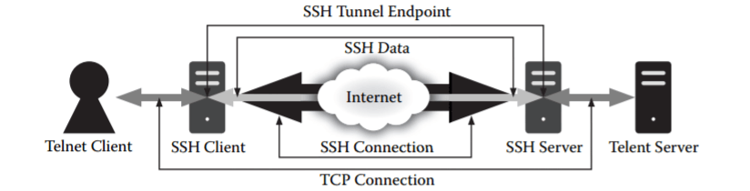 SSH connection. This other side then forwards the data to the specified TCP destination. An SSH tunneling configuration can become more complicated, because users can configure it to provide a reverse tunnel or arbitrary application proxying through protocols such as SOCKS, but the underlying concept remains the same. Picture shows how an SSH connection can tunnel a Telnet connection securely between trusted environments. The example tunnels traffic between two unrelated hosts that have no SSH capability to illustrate the flexibility of the solution.
